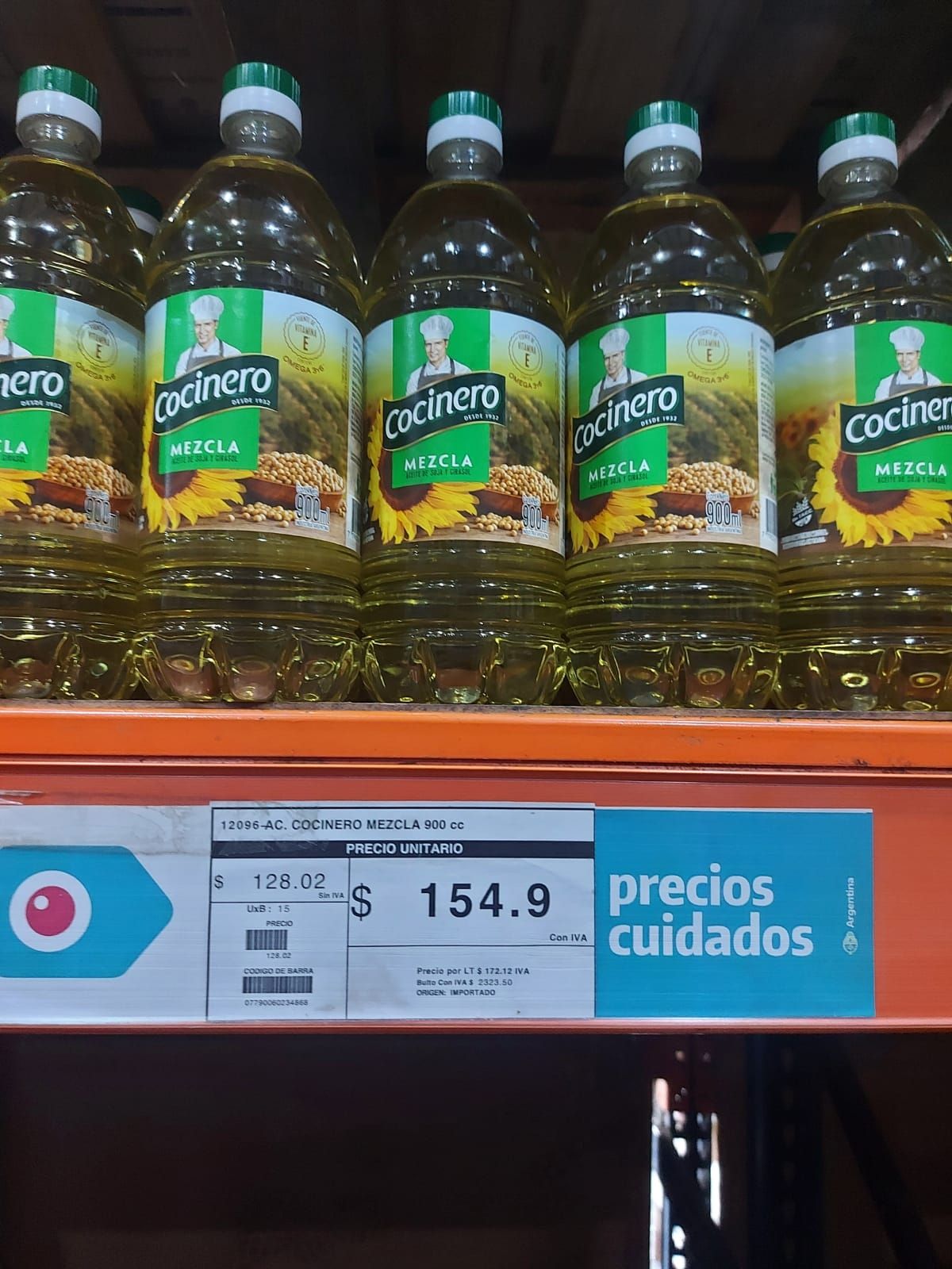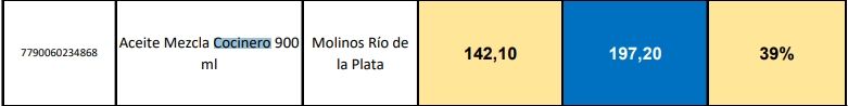 Podemos ver como a pesar de que el aceite Cocinero cuenta con el cartel de "Precios Cuidados", no cumple con el precio prometido en la lista publicada desde comienzo de mes. Debería venderse a $142,10 en los mayoristas para lograr comercializarse a $197,20 en los almacenes, pero, nuevamente la realidad es distinta, ya que se puede ver que en el mayorista se encuentra a $154,90.