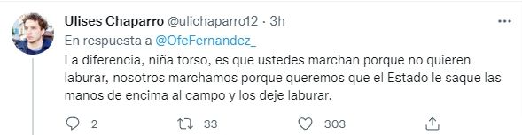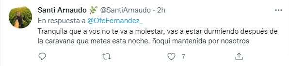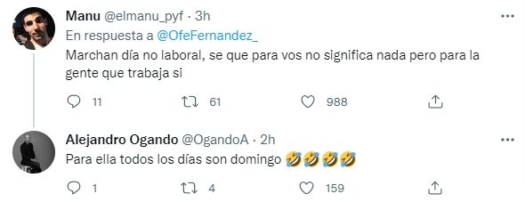 Entre los comentarios destacados hay uno de Iñaki Gutiérrez, un conocido joven libertario, que se ha demostrado en contra de la legisladora en múltiples ocasiones. "Hay marchas de quienes trabajan y marchas de quienes piden mas plata por no trabajar. Hay marchas que se hacen una vez por año y otras que se hacen todos los días. Hay marchas que te cagan la vida los días de semana y esta que se hace un sábado. Marchan los que te mantienen, Ofe", comentaba Gutiérrez.