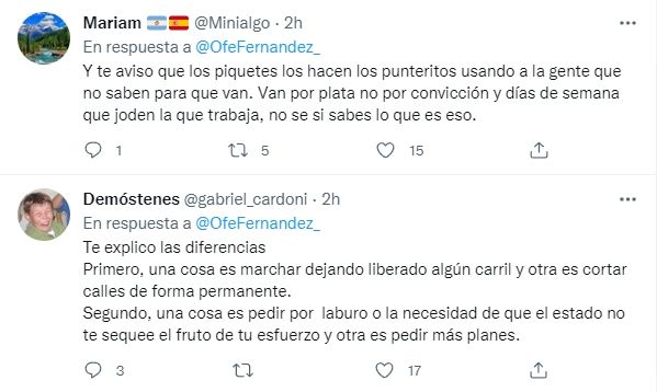 Por otra parte, Gonza Vicenti exclamaba: "Entre el que marcha por su trabajo y el que la marcha es su trabajo…hay una diferencia abismal Ofelia, saludos".
