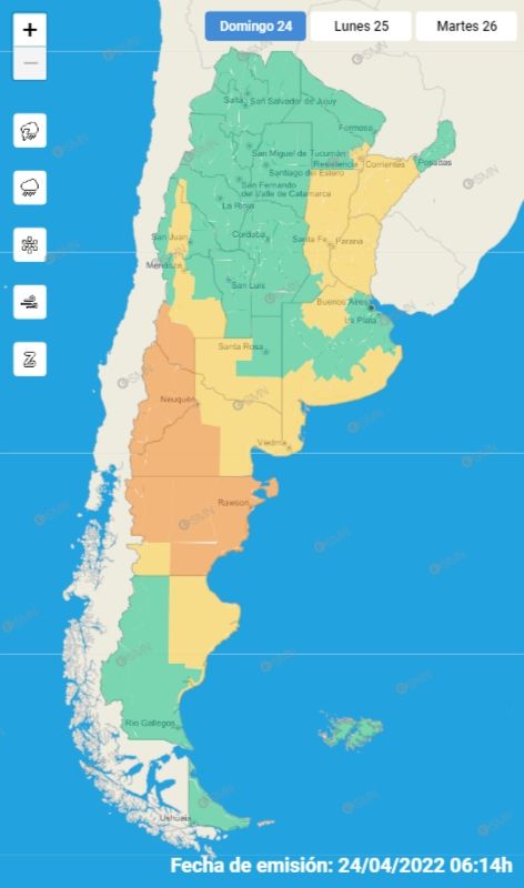 Además, habrá alerta amarilla por vientos en zonas deCorrientes y Entre Ríos, tormentas y vientos en Santa Fe, Entre Rios, este de Chaco y solo vientos en el sur bonaerense, centro y este de Río Negro y zonas de La Pampa. También rige alerta amarilla por viento Zonda en zonas de Mendoza y San Juan.