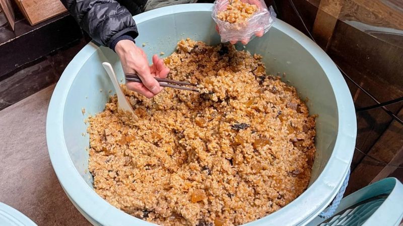 El otro, me dijo la matriarca Fumiyo Kubota, es su salsa de soja "light". Está elaborada con un 70 % de soja y un 30 % de trigo. Cuando pasé, ella estaba ocupada preparando koji, la mezcla de koji kin, soja y trigo, en preparación para un nuevo lote de salsa de soja que se elaborará durante los próximos 1,5 a dos años.