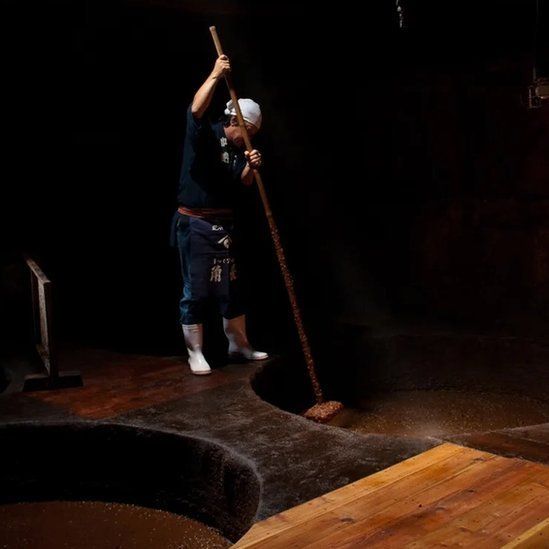 Kano, un hombre de aspecto poderoso, cuenta que gran parte del trabajo se hace a mano. Esto incluye mezclar regularmente el puré en sus 34 barriles grandes con largas paletas de madera y exprimir la salsa de soja del puré cuando esté listo.