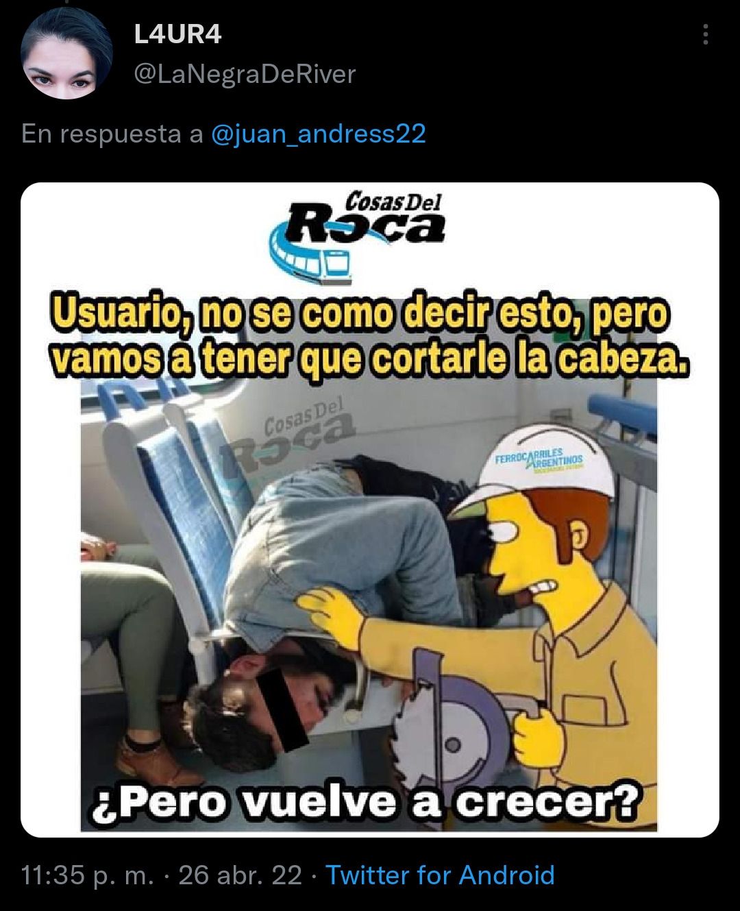 Otro sube un meme que contiene un diálogo de Los Simpson: "Usuario, no sé cómo decir esto, pero vamos a tener que cortarle la cabeza". Además, bromea con una falsa respuesta del joven: "¿Pero vuelve a crecer?"