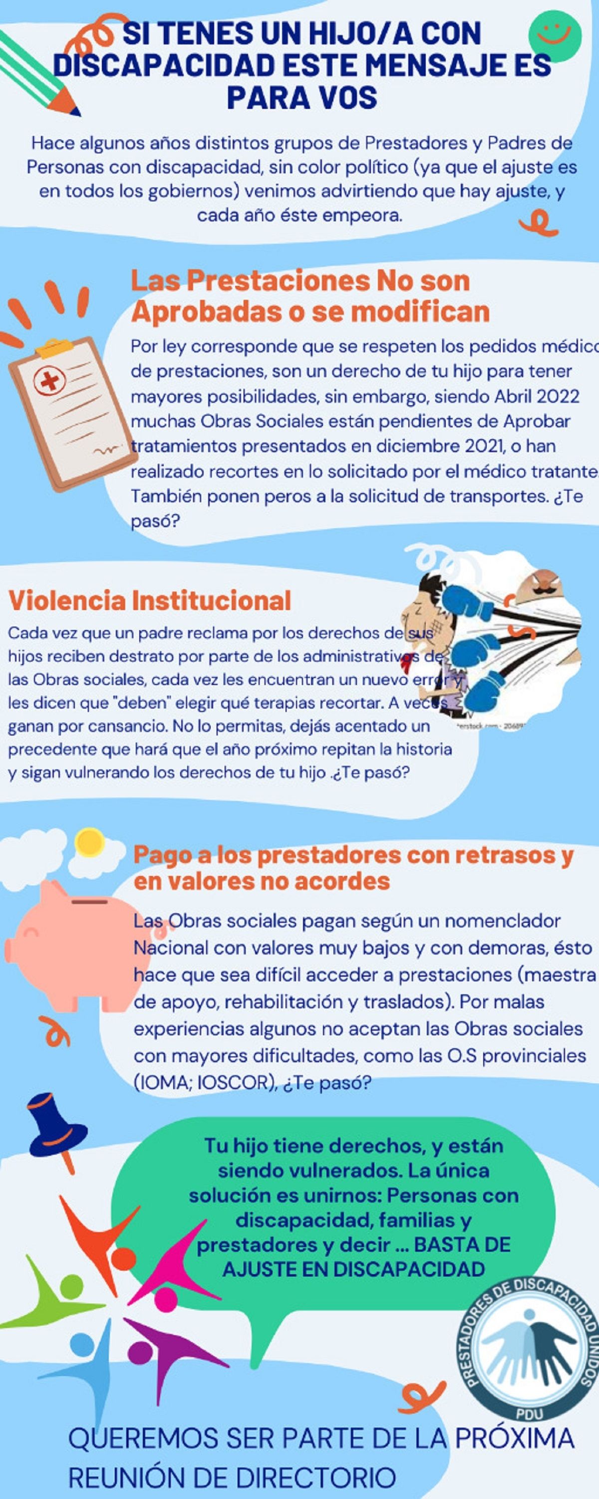 De hecho, este jueves en todo el país, las entidades que nuclean a prestadores de la salud dedicados a atender y practicar terapias a personas con discapacidad, se unirán en una misma voz y se movilizarán junto a las familias afectadas como consecuencia de las trabas a la hora de lograr una adecuada cobertura; derecho que por ley den ser contemplado y garantizado. En Mendoza, la convocatoria para reclamar por los derechos de miles de personas que atraviesan por complejas y dolorosas situaciones como consecuencia de las dilaciones para acceder a las prestaciones, está programada para las 10:30 en el Parque Cívico (franja este).