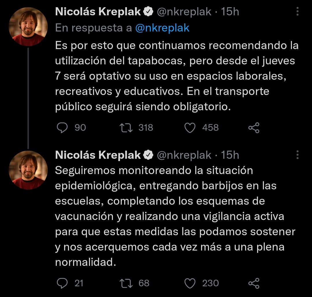 De esta manera el ministro hizo el anuncio, advirtiendo que siguen recomendando que el barbijo se siga usando: "Es por esto que continuamos recomendando la utilización del tapabocas, pero desde el jueves 7 será optativo su uso en espacios laborales, recreativos y educativos. En el transporte público seguirá siendo obligatorio. Seguiremos monitoreando la situación epidemiológica, entregando barbijos en las escuelas, completando los esquemas de vacunación y realizando una vigilancia activa para que estas medidas las podamos sostener y nos acerquemos cada vez más a una plena normalidad".