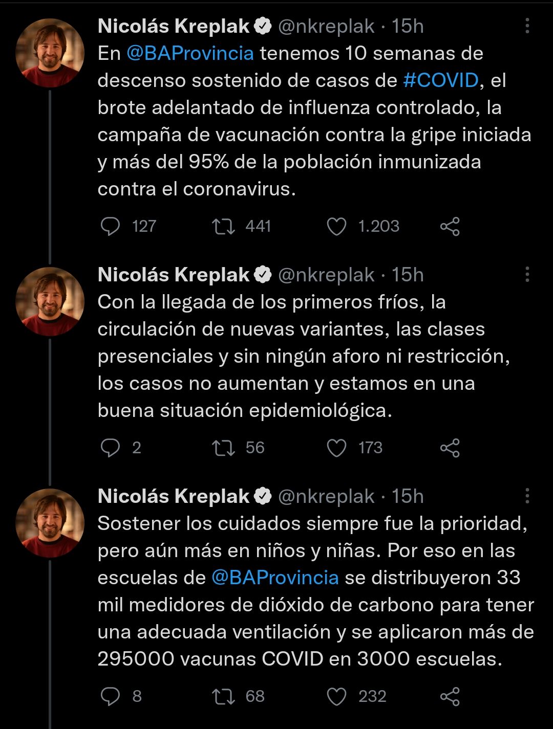 Nicolás Kreplak, ministro de Salud de la provincia, explicó los motivos que llevaron a tomar finalmente la decisión: "En el Gobierno de la Provincia tenemos 10 semanas de descenso sostenido de casos de covid, el brote adelantado de influenza controlado, la campaña de vacunación contra la gripe iniciada y más del 95% de la población inmunizada contra el coronavirus. Con la llegada de los primeros fríos, la circulación de nuevas variantes, las clases presenciales y sin ningún aforo ni restricción, los casos no aumentan y estamos en una buena situación epidemiológica". Kreplak también destacó las prevenciones que ya se venían aplicando en los últimos tiempos por la pandemia: "Sostener los cuidados siempre fue la prioridad, pero aún más en niños y niñas. Por eso en las escuelas de el Gobierno de la Provincia se distribuyeron 33 mil medidores de dióxido de carbono para tener una adecuada ventilación y se aplicaron más de 295000 vacunas covid en 3000 escuelas".