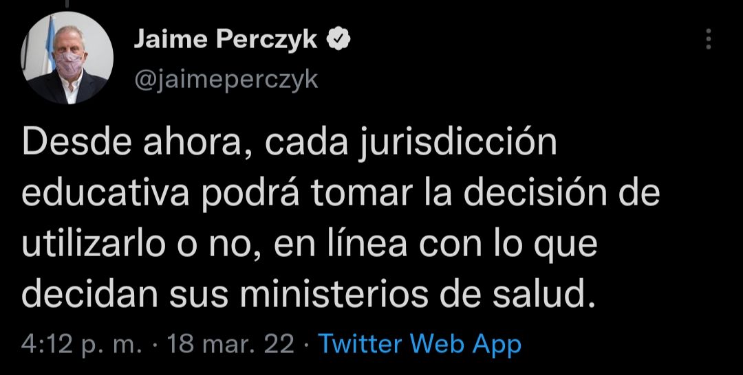 El pasado 18 de marzo el Gobierno anunció que cada provincia podría definir si el uso de barbijo sería obligatorio u opcional en las escuelas, más allá de asegurar que siempre existió el derecho a la "libertad de acción" para tomar esa decisión. Lo confirmó Jaime Perczyk, ministro de Educación, quien declaró: "Desde ahora, cada jurisdicción educativa podrá tomar la decisión de utilizarlo o no, en línea con lo que decidan sus ministerios de Salud".