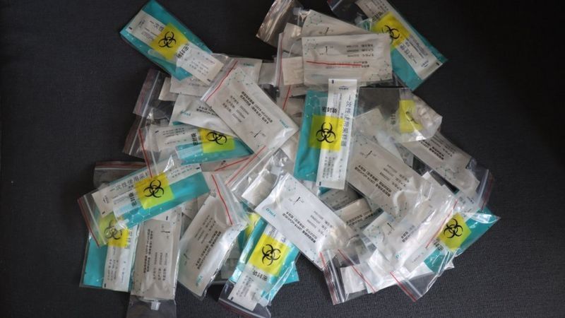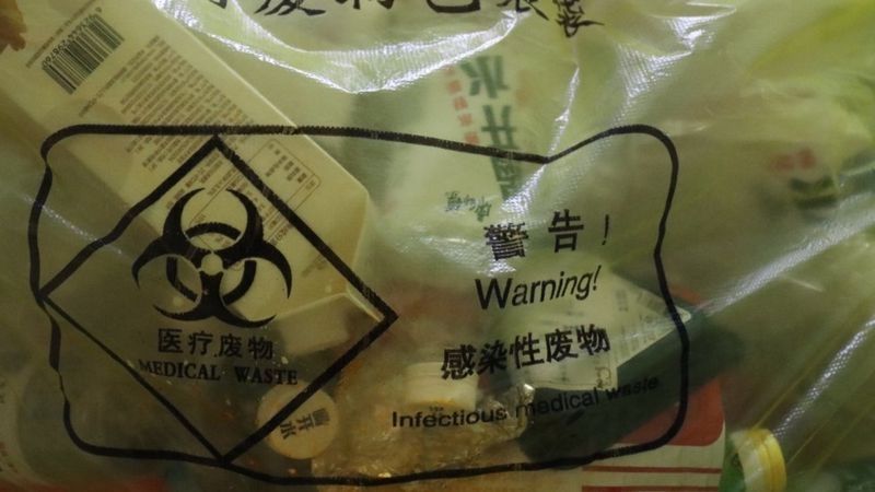 Antes de las seis de la tarde, debemos enviar una foto a la conserje con nuestras últimas pruebas. Los desechos se acumulan en la cocina, apilados en bolsas amarillas que advierten en inglés y chino: "Cuidado, residuos médicos infecciosos".