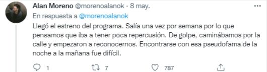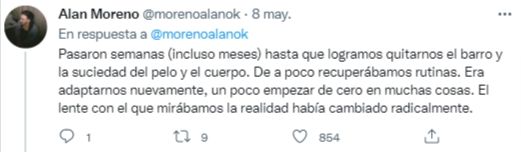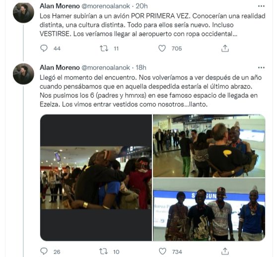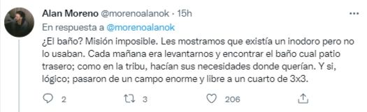 Entre lo más destacado de este hilo, Moreno comentaba su mes en la tribu y recordaba los grandes temores que tenía su familia en un clima tan hostil, pero que con el tiempo se convirtió en cotidiano.