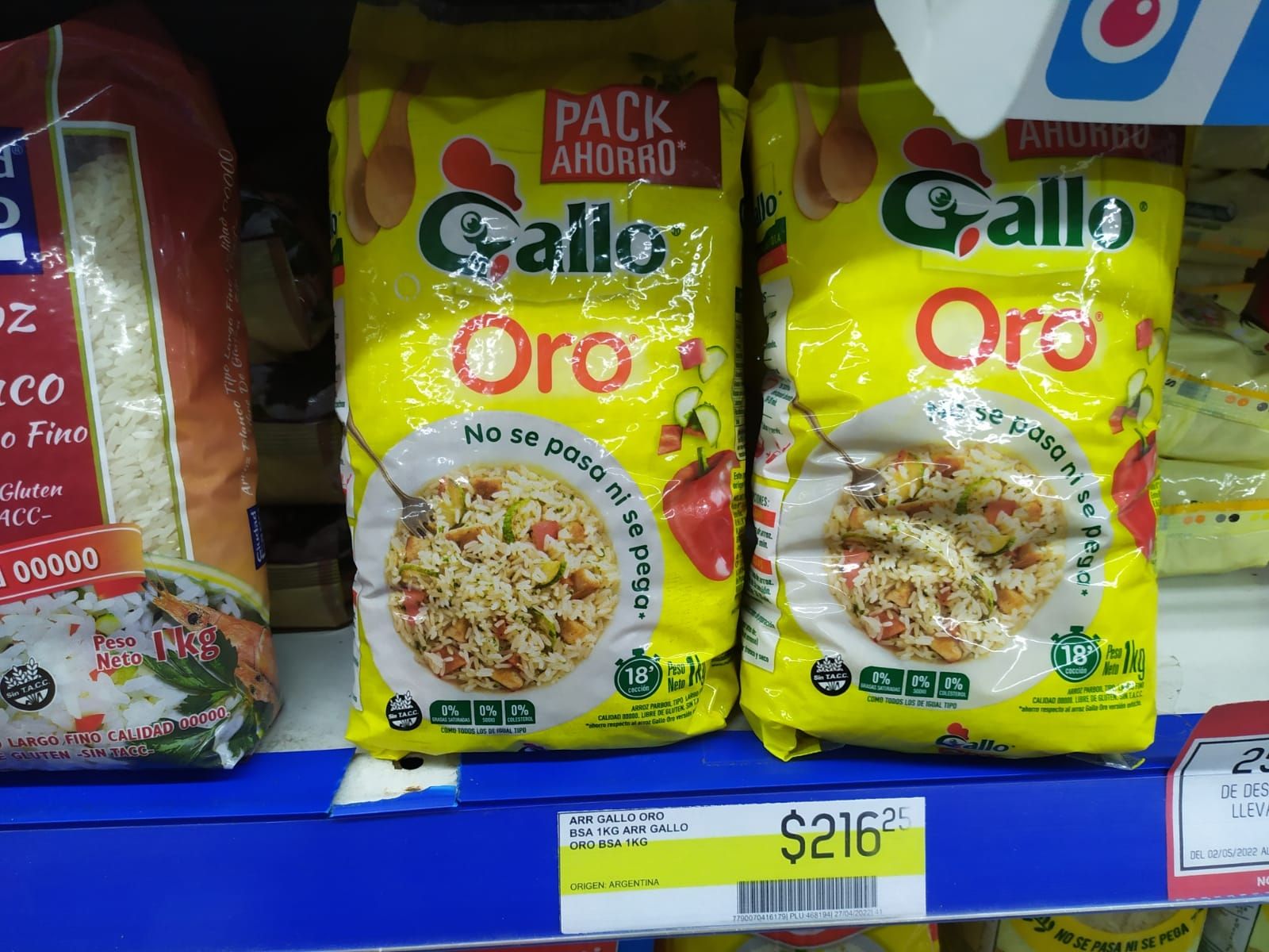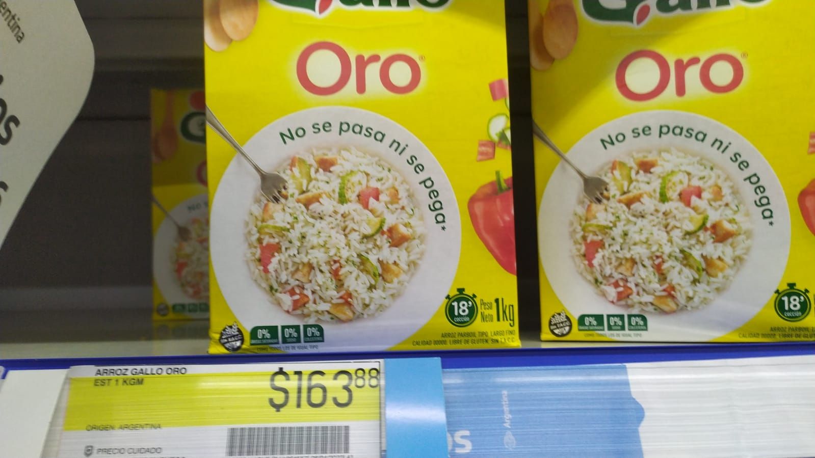 Luego existe un caso curioso, donde el arroz Oro de 1kg de la marca Gallo en caja está en Precios Cuidados y cuesta $163,88, mientras que su equivalente pero en una bolsa cuesta $216,25, es decir, más de $50 más por no estar en Precios Cuidados.