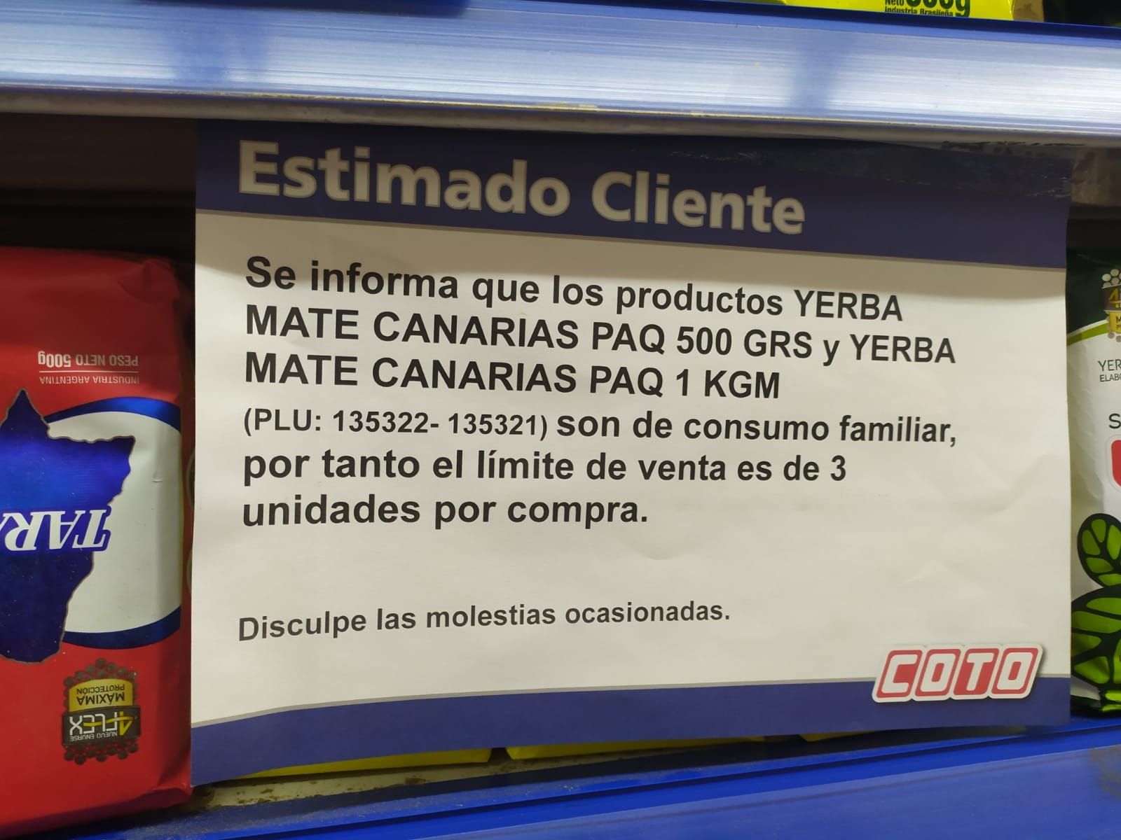 Estos carteles se suman a otros que anuncian como algunos productos tienen consumos limitados, como es el caso de la yerba de la marca Canarias donde explican que los productos son de "consumo familiar, por tanto el límite de venta es de 3 unidades por compra".