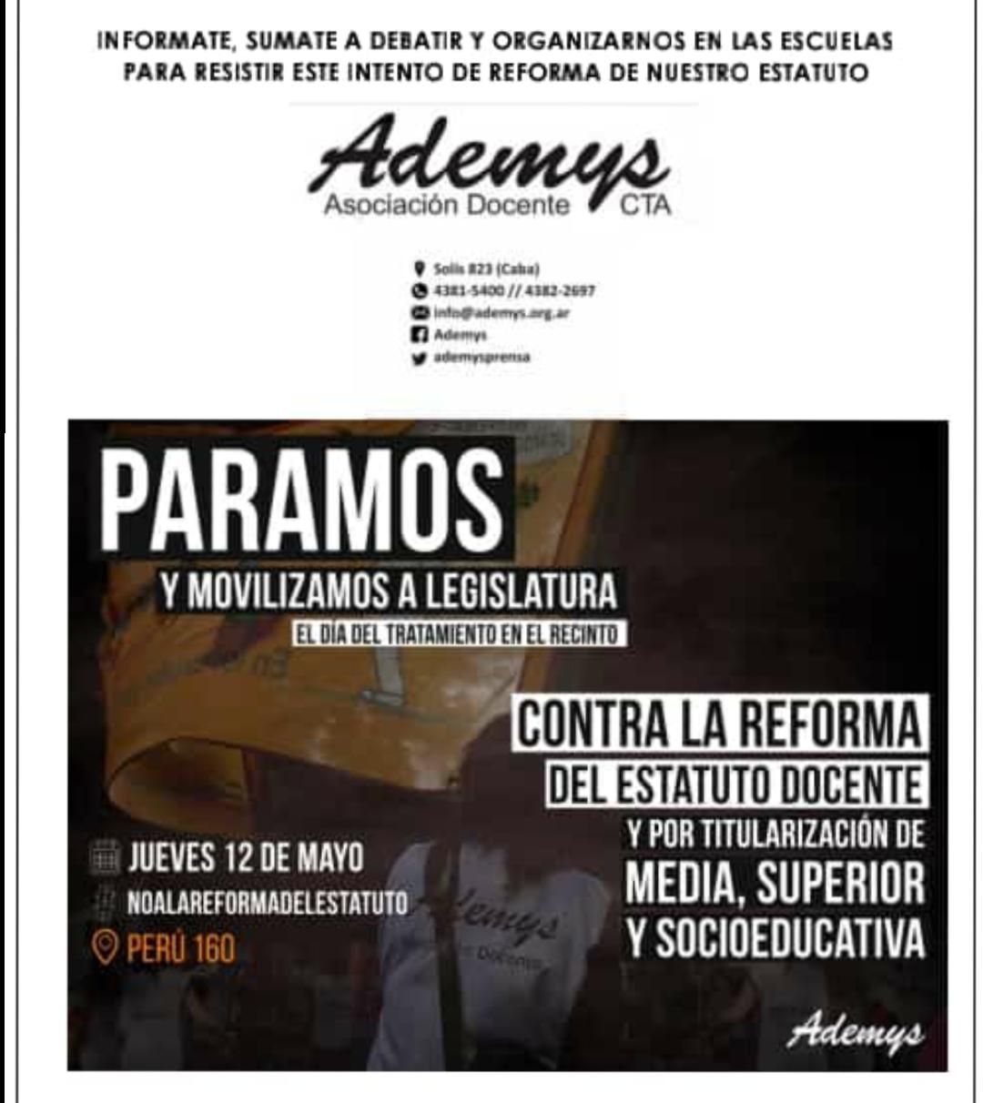 UTE-Ctera y Ademys, dos sindicatos docentes de la Ciudad de Buenos Aires, anunciaron un paro docente de 24 horas para este jueves 12 de mayo.