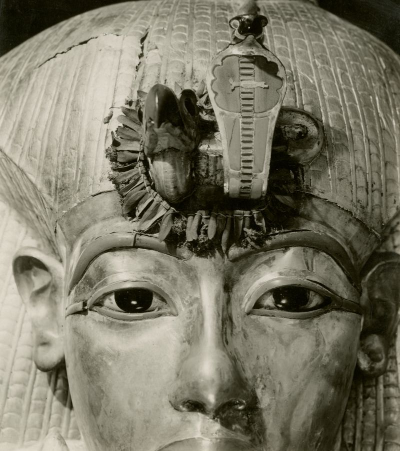 La visión íntima de Burton del ataúd exterior de Tutankamón se centra en la guirnalda de acianos y hojas de olivo que adornan la frente del joven rey.