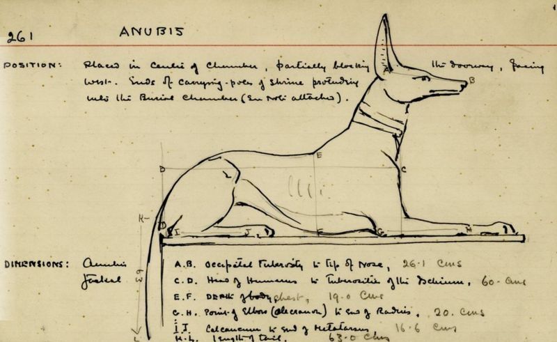 Una estatua de Anubis, el dios chacal de los muertos, es el tema de este dibujo de Carter, que incluye notas y medidas.