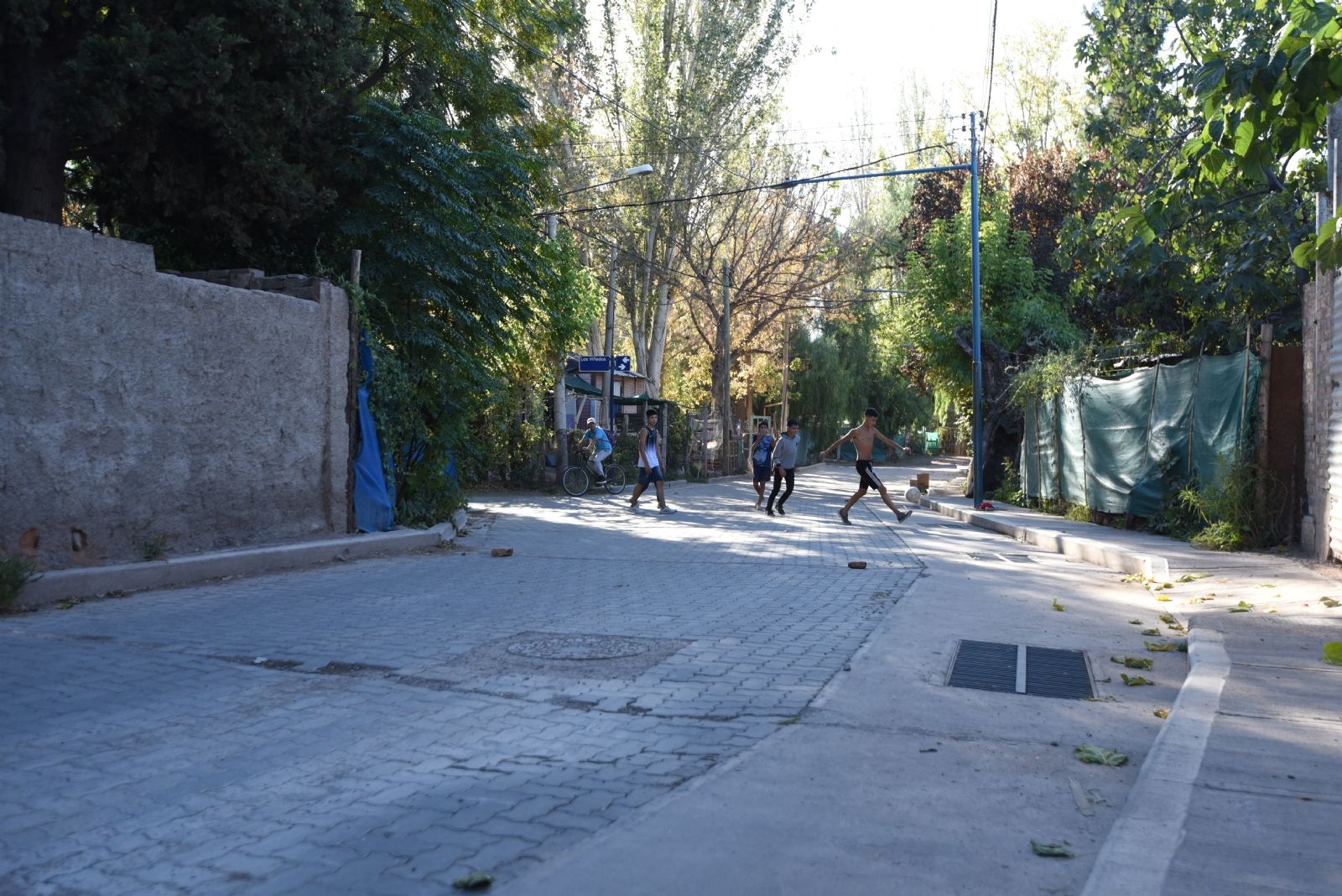 Ya casi es mediodía. En las afueras de las casas, la mayoría construida ya con material, hay poco movimiento. Las calles, cuyos nombres fueron elegidos por los propios vecinos que buscaron dar identidad con el esfuerzo de los cosechadores, llevan el cartel de varietales, como Malbec, o sitios cargados de belleza, como Lago Hermoso. Casi todos los niños están en la escuela. "Siempre se piensa que acá la gente no trabaja o que hay inseguridad. Pero la realidad es que son todas familias que salen a trabajar, a ganarse el día a día para sostener a sus hijos y darles un techo digno", aclara Verónica con la clara idea de derribar los estigmas que históricamente han pesado sobre las personas que se ven acorraladas por un círculo de pobreza que se repite de generación en generación.