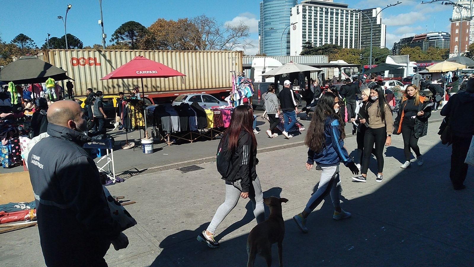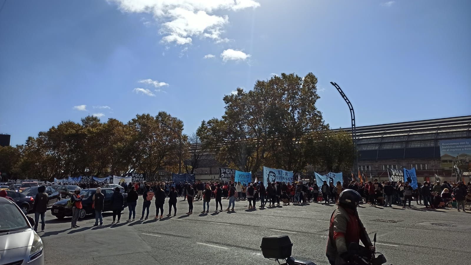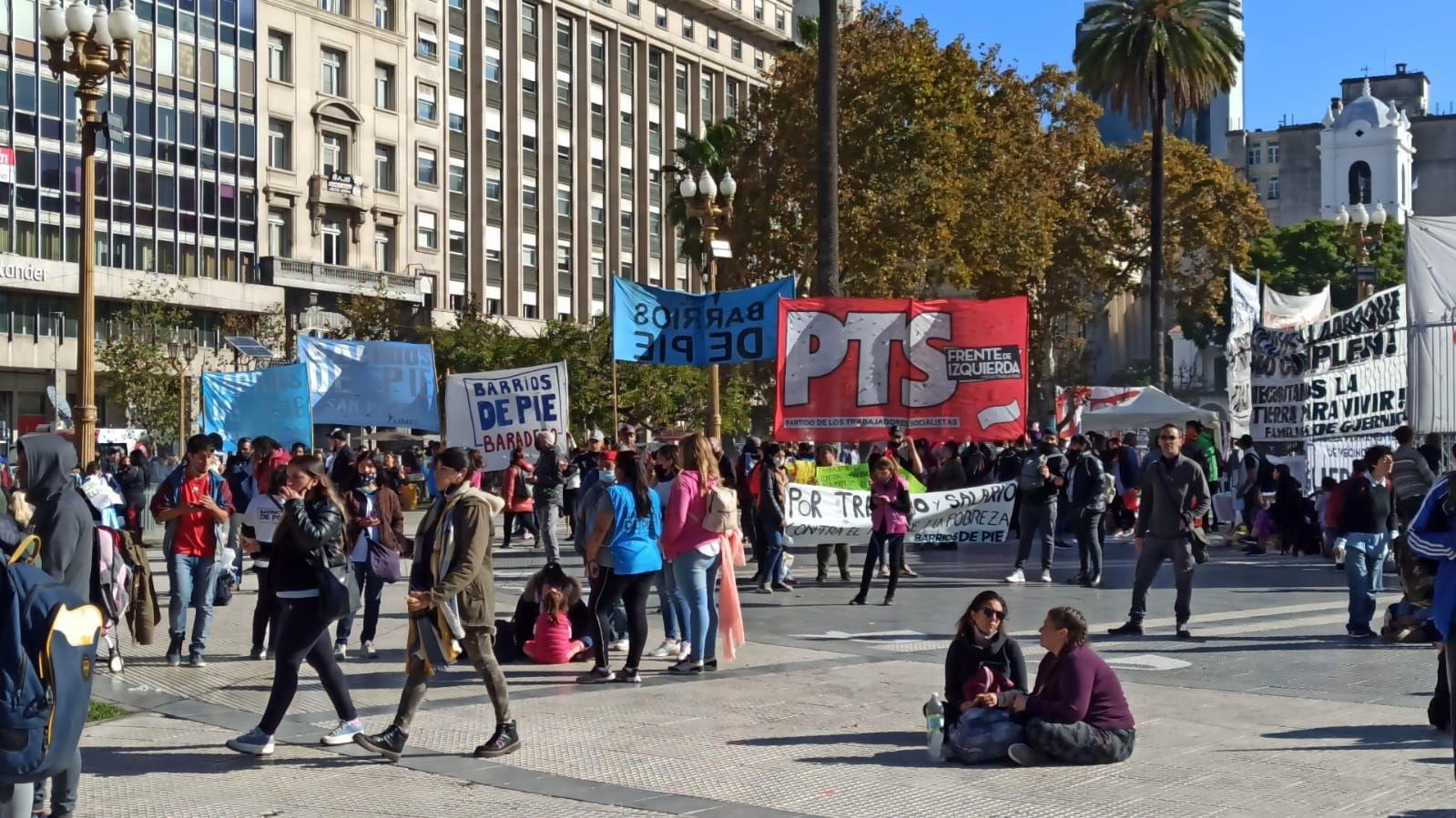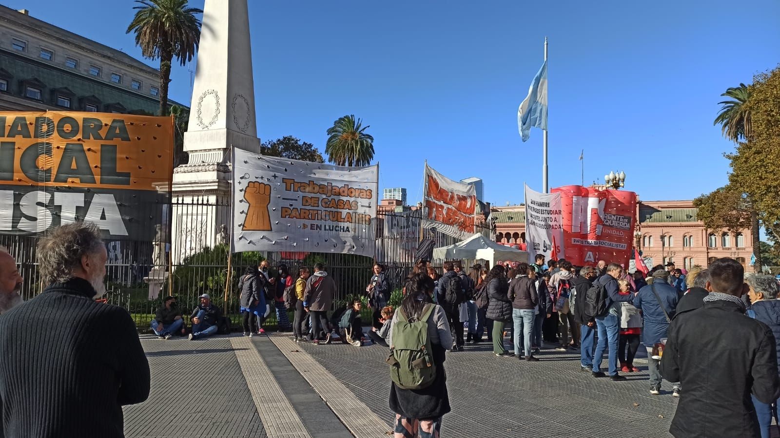 15:50h. Al compás de los bombos, el Polo Obrero arribó a la plaza. Se ve una humareda proveniente de las múltiples parrillas de vendedores de choripanes. Además, se escucha música a alto volumen. Las trabajadoras de casas particulares también se hicieron presentes en la marcha.