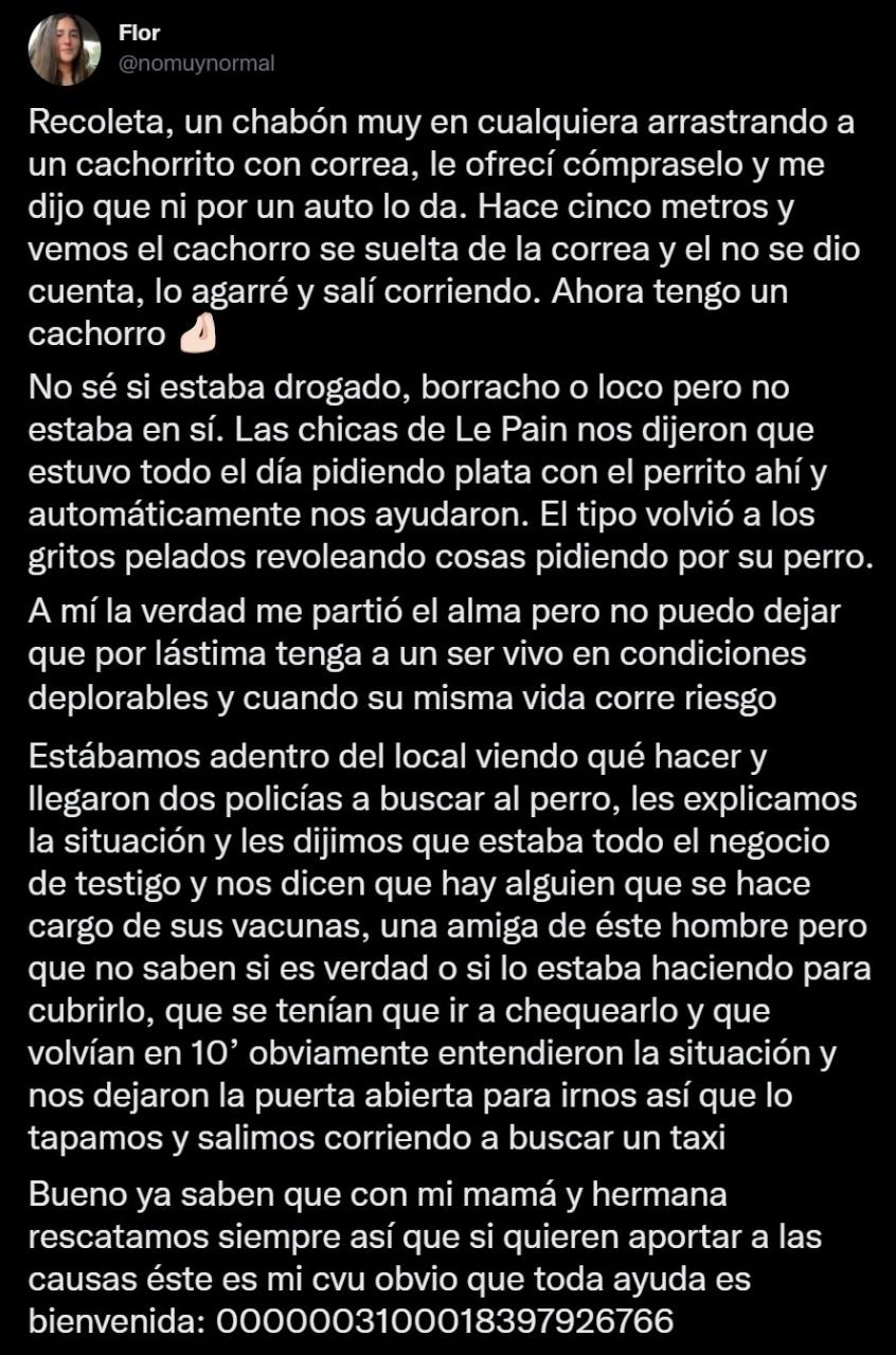Sin embargo, parece que la negativa del sujeto no fue suficiente. "Hace cinco metros y vemos el cachorro se suelta de la correa y el no se dio cuenta, lo agarré y salí corriendo. Ahora tengo un cachorro", agregó en su hilo alegando que, según suponía, el hombre estaba incapacitado para cuidar un animal y su intención era evitar el maltrato que pudiera sufrir el canino por parte de este señor que se trenzó en una discusión para recuperar a su perro, mientras la chica se resguardo en una confitería.