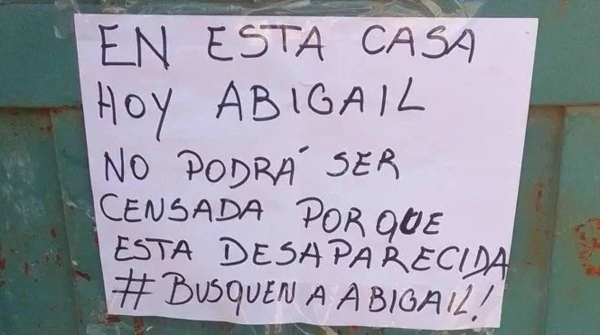 En Mendoza, Verónica Carniel también aprovechó el Censo 2022 para insistir en que busquen a su hija. "Hoy Abigail no puede ser censada", dice el cartel que pegó en su casa y el lema se repite en un flyer que circula por redes sociales. "No estamos todos. En Mendoza faltan Abigail Carniel, Gisela Gutiérrez y Viviana Luna".