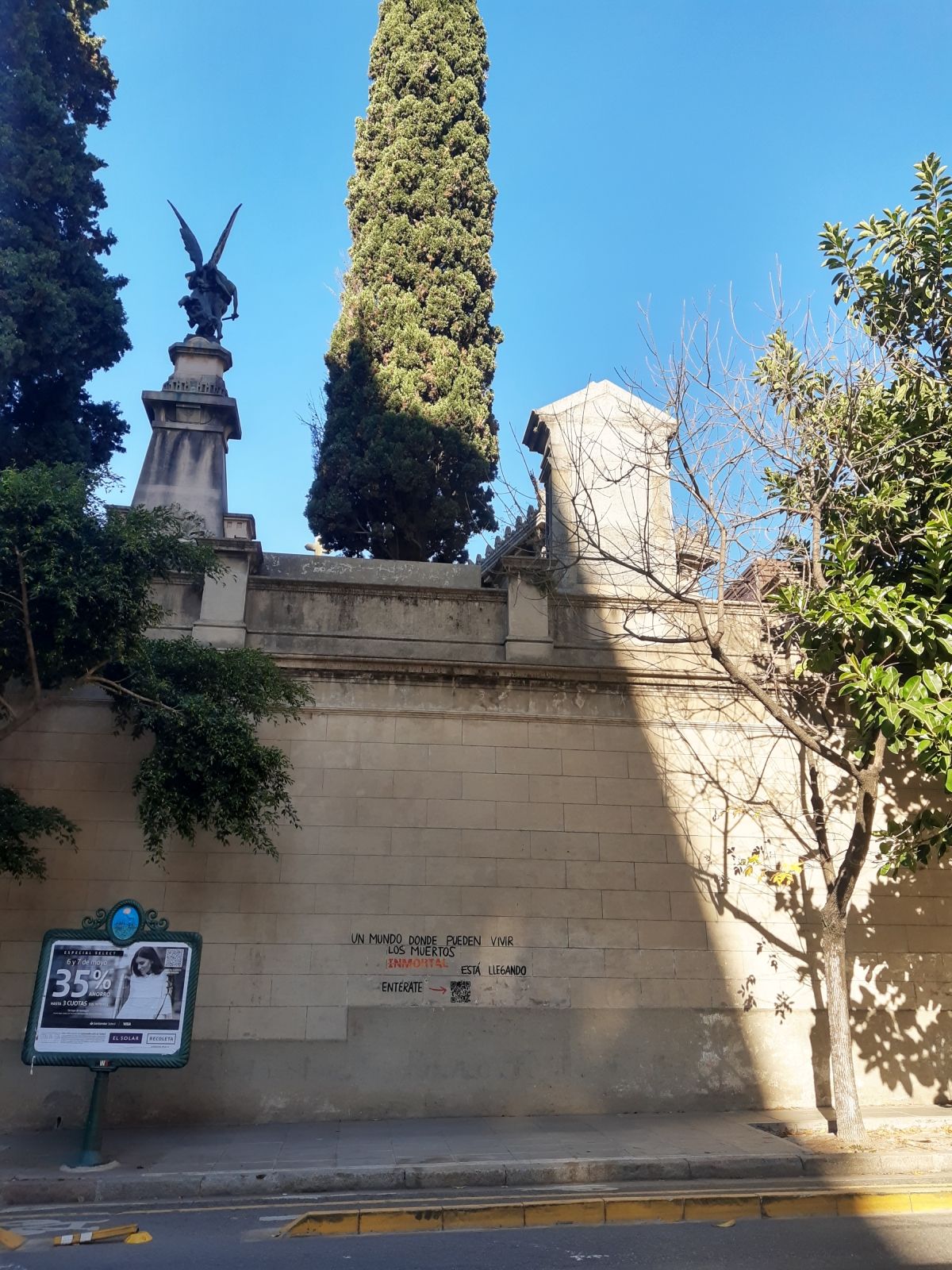 Varios transeúntes y vecinos se han detenido a leer la inscripción en una de las paredes del emblemático Cementerio de la Recoleta. "Un mundo donde pueden vivir los muertos. Inmortal está llegando. Enterate", se lee allí. Junto a esa frase también hay pintado un código QR, desde el que se accede al tráiler de la película de Fernando Spiner, Inmortal.