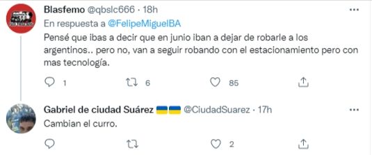 Una usuaria comenta: "... no pienso volver a votarlos... ni a vos, ni a Larreta...espero q el prox. de marcha atrás con ésto... en lugar de facilitar las cosas las complican... hay cada vez menos lugar para estacionar y las cocheras inaccesibles ($$) pero uds. siempre priorizando su "negocio"".