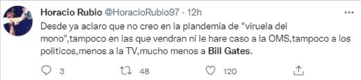 Algunos de los hashtags que acusaban al millonario eran #BillGatesBioTerrorist -en español Bill Gates Bioterrorista- y #BillGatesMonkePox -Bill Gates viruela de mono-. Estos ataques se basan en que el fundador de Microsoft tiene acciones en diferentes farmacéuticas, por lo que estaría buscando favorecerse de las vacunas que serían necesarias en caso de que esta enfermedad se expanda.