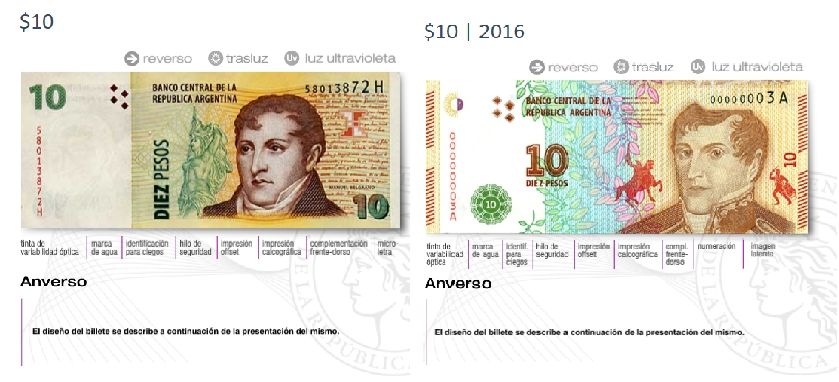 En detalle, hay dos versiones de billetes de $10. El primero fue lanzado en 1998 y el segundo en 2016. Ambos llevan la imagen de Manuel Belgrano.