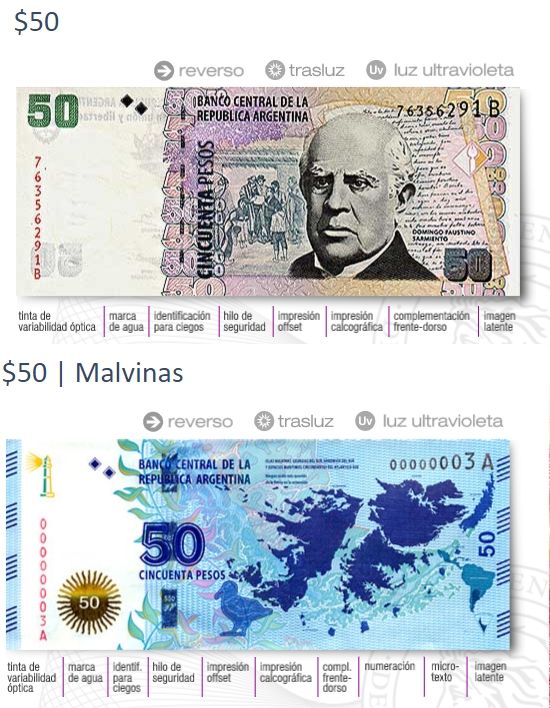 Por su parte, el de 50 se lo ve con las imágenes de Domingo Faustino Sarmiento, de las Islas Malvinas y del cóndor.