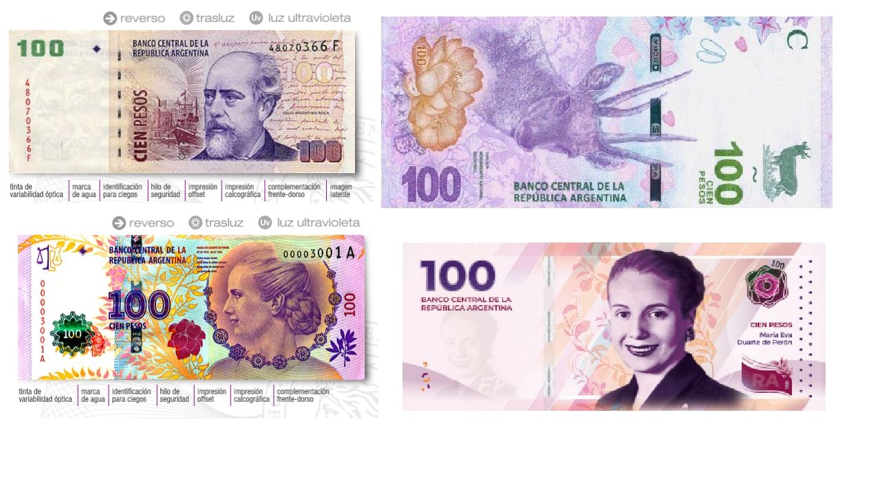 En la denominación de $100 es donde se habrá mayor confusión ya que circularán y serán válidos los que tienen las figuras del ex presidente Julio Argentino Roca, de la ex primera dama María Eva "Evita" Duarte de Perón y la taruca (los dos primeros cuentan con tres series cada uno). A esto se le sumará otro modelo de Eva Perón.