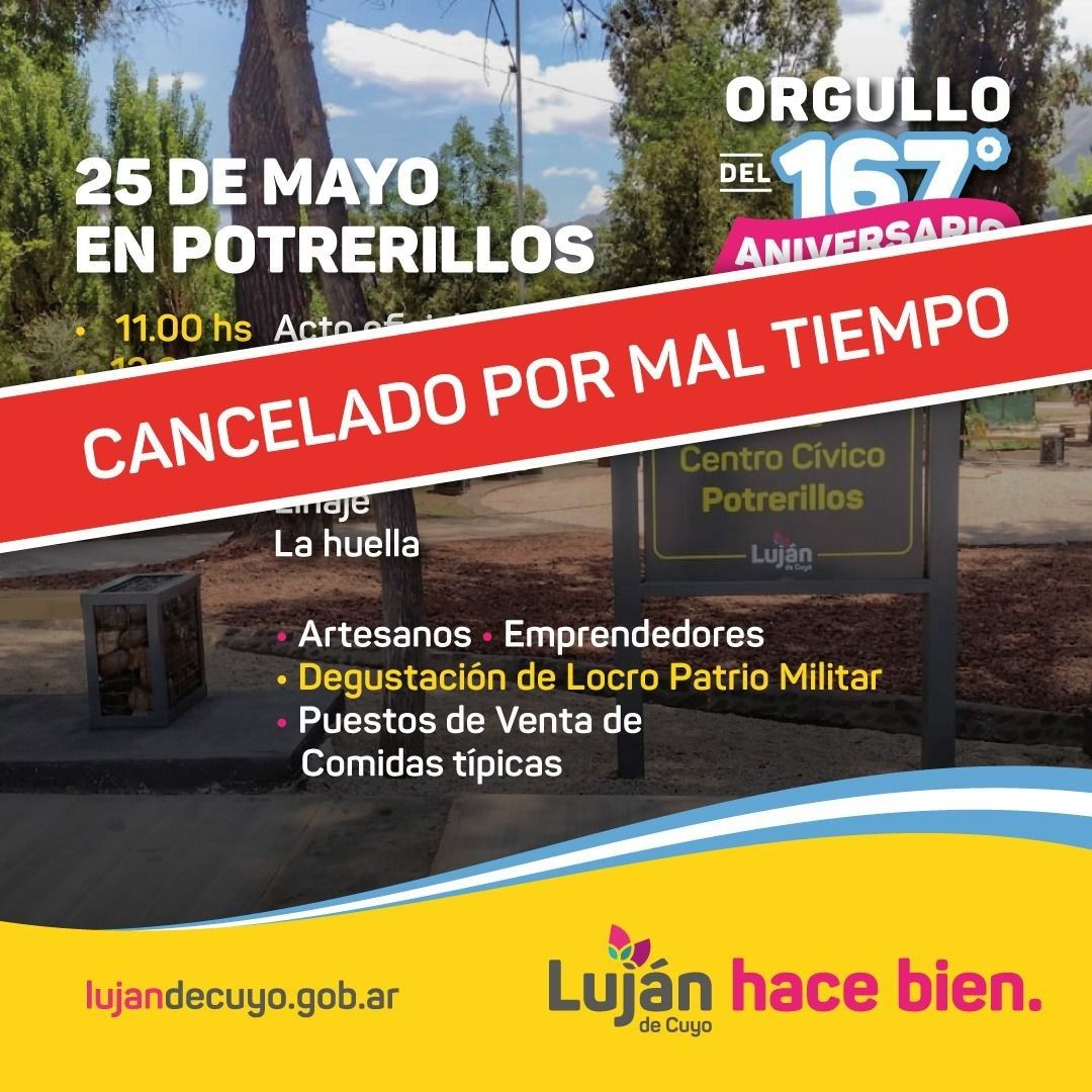 Teniendo en cuenta las condiciones de inestabilidad y las bajas temperaturas que se esperan para este miércoles en alta montaña, desde la Municipalidad de Luján de Cuyo informaron la suspensión de los eventos previstos para este 25 de Mayo en Potrerillos.