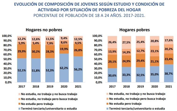 El informe remarca algunos datos preocupantes, como que los jóvenes de 18 a 24 años excluidos del sistema educativo representan a más de la mitad, de los cuales un cuarto de ellos no estudia ni trabaja, por lo que son doblemente excluidos. Esto se da tanto de la educación como del mercado laboral. A nivel global, los indicadores mejoraron: cada vez hay más jóvenes que estudian o trabajan y son menos los que no estudian ni trabajan ni están buscando trabajo. Hace 5 años, 16,4% de los jóvenes integraban el grupo llamado "NiNi" (ni estudian ni trabajan y tampoco buscan trabajo) y en 2021 el índice bajó a 14,8%. Sin embargo, al desagregar mujeres y varones o diferenciar entre quienes se encuentran por encima o por abajo de la línea de pobreza, el resultado muestra una tendencia preocupante.