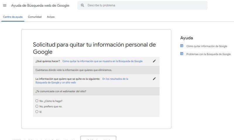 Después se llena el formulario que pueden encontrar acá. Allí se pide que se especifique si se desea borrar la información de una búsqueda de google específica o de un sitio web.