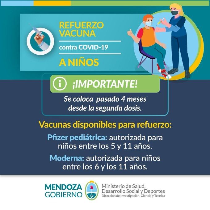 "Desde este lunes 30 de mayo, Mendoza comenzará a aplicar la vacuna de refuerzo contra covid-19 a niños y niñas entre 5 y 11 años de edad", anunció la ministra de Salud, Ana María Nadal, en su cuenta de la red social Twitter.