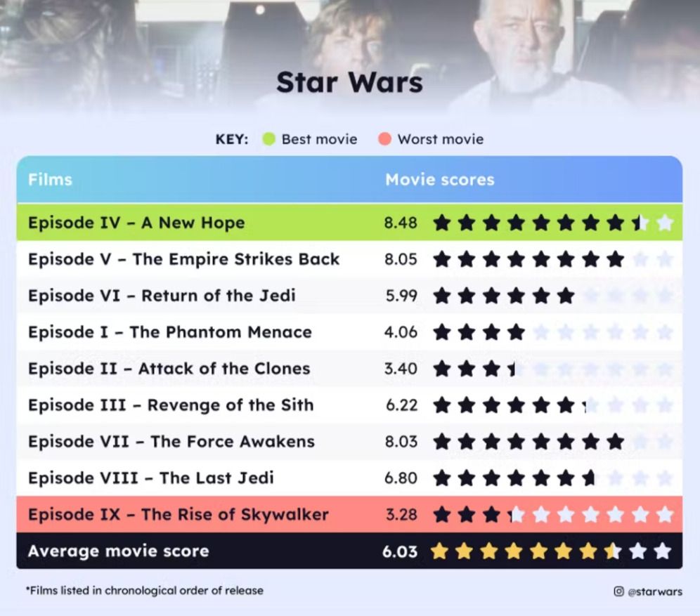 Uswitch, proveedor de servicios de banda ancha y servicio de comparación de precios, hizo un estudio con las 20 franquicias de películas más taquilleras y sus secuelas para identificar las mejores y las peores. El informe reunió los puntajes de los sitios con reseñas más prestigiosos: IMDb, Metacritic y Rotten Tomatoes. El promedio de estos sumado a los ingresos y rentabilidad de la taquilla de cada una de las películas dieron los resultados finales. En el caso de Star Wars, solo se tuvo en cuenta los 9 films de la saga Skywalker, dejando de lado los spin-offs.