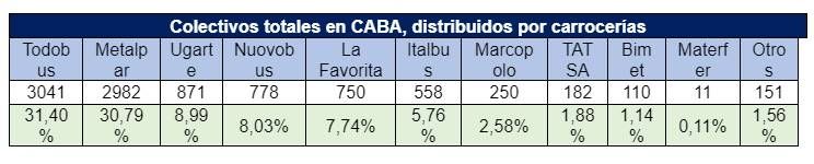 Todobus y Metalpar son las carrocerías que más vemos en CABA, Ugarte viene acercándose a las 1000 unidades, beneficiada en parte por el cierre de Metalpar. Nuovobus, de la mano de COLCAR (concesionario de Mercedes Benz) busca mayor presencia. La Favorita no le pierde pisada a Nuovobus. Más atrás vienen Italbus y la sucesora de Metalpar, la multinacional “Marcopolo”, que carroza en Villa Gobernador Gálvez a diferencia del resto de las carrocerías netamente urbanas que lo hacen en el AMBA.