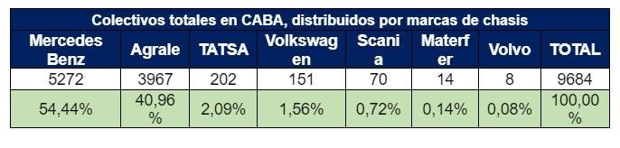La frase tiene mucho sentido si la trasladamos a los números de hoy: de los 9684 coches totales, más del 54% son Mercedes Benz. Aunque su competencia es fuerte: Agrale se acerca al 41%. El restante 5% se reparte entre la extinta TATSA, la marca del Grupo Plaza; la alemana Volkswagen; los suecos de Scania y Volvo, ésta última muy cerca de la fábrica local Materfer, marca más conocida por trenes y subtes pero que también tiene su división de buses.