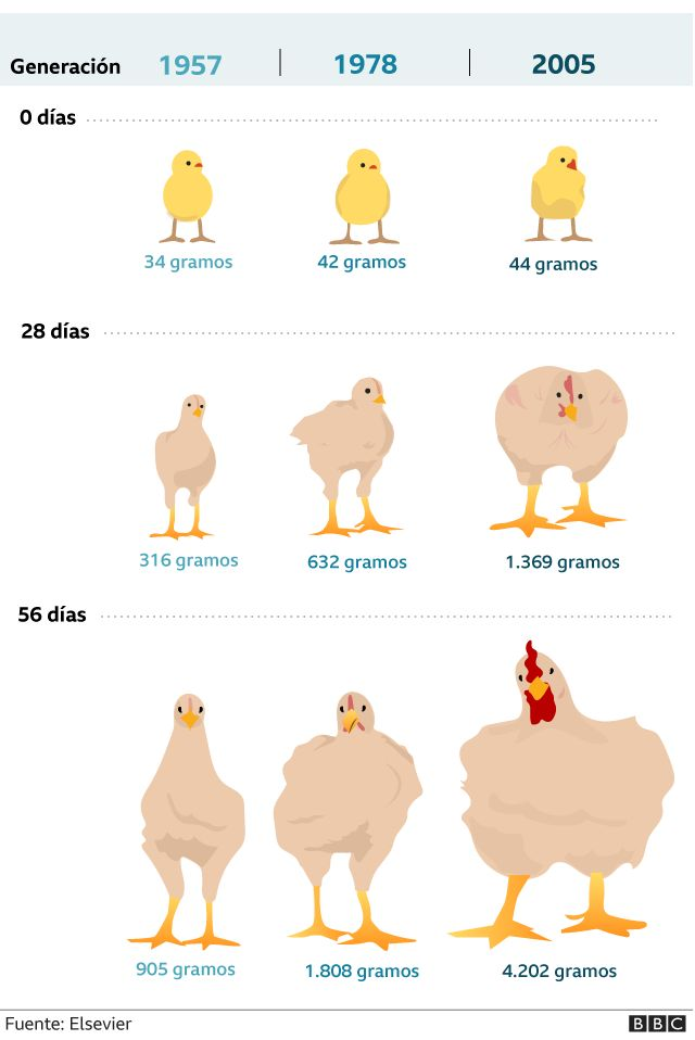 En poco más de medio siglo, según un estudio de la Universidad de Alberta publicado en 2014, el tamaño promedio de un pollo de engorde aumentó en un 400%.