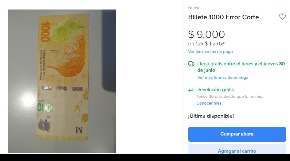 Se puede ver un billete de $1.000 que se vende por $9.000. Este producto se ofrece en Mercado Libre, un lugar donde es muy común ver publicaciones de billetes de este estilo, ideales para los fanáticos de la numismática.