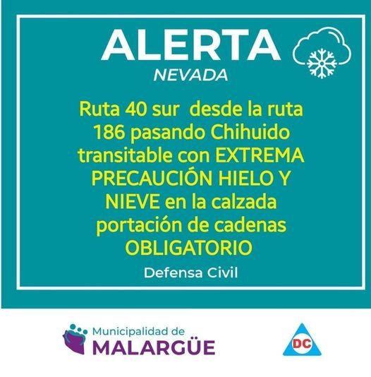 Defensa Civil lanzó un comunicado en la mañana de este miércoles pidiendo a los conductores que transiten con precaución en la zona sur de la ruta 40. Más específicamente, al pasar la ruta 186 en el área de Chihuido.