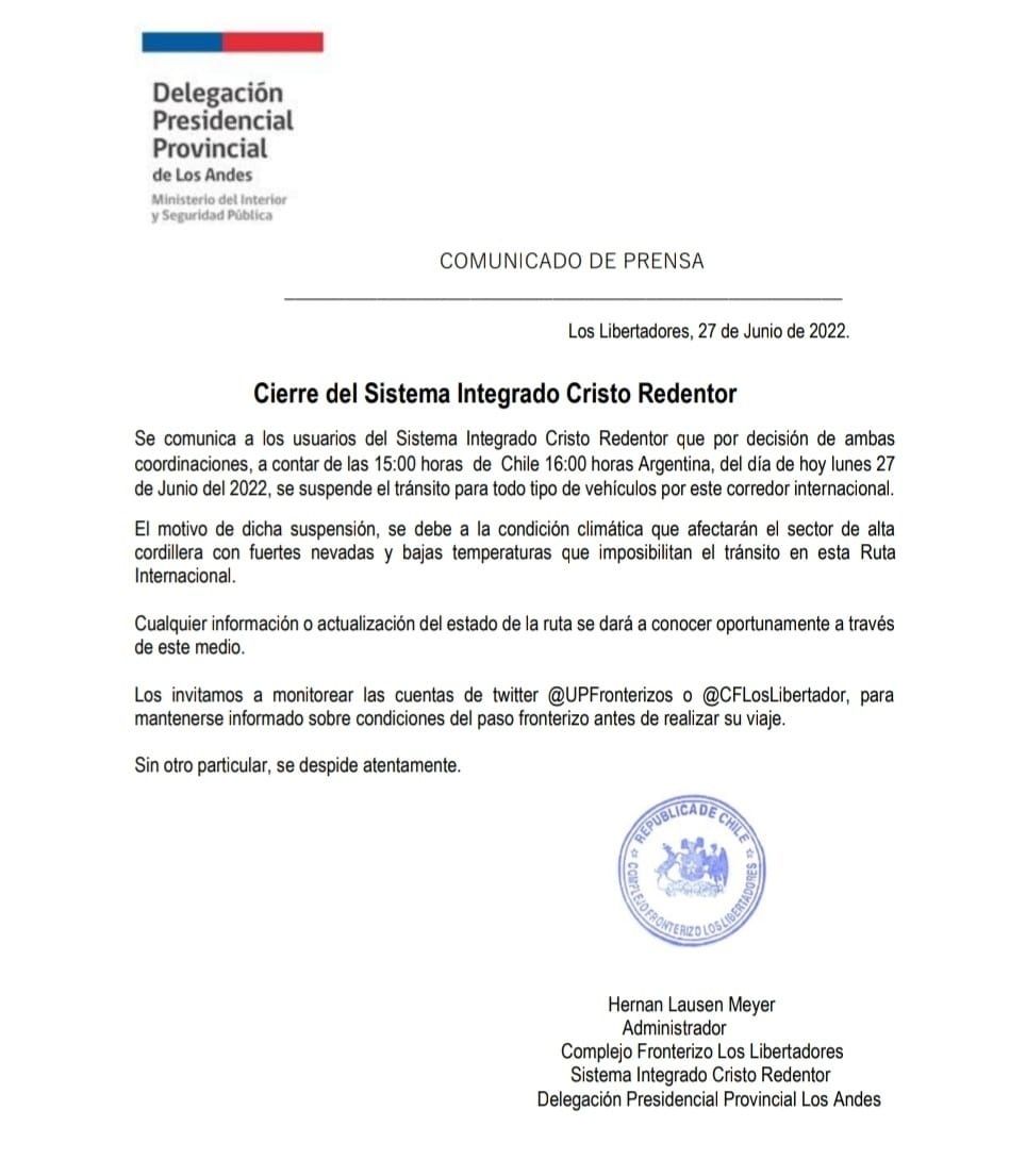 El Sistema Integrado Cristo Redentor, a las 16:00 horas de Argentina, fue cerrado por decisión de ambas coordinaciones. Se suspendió el tránsito de todo tipo de vehículos por este corredor internacional.