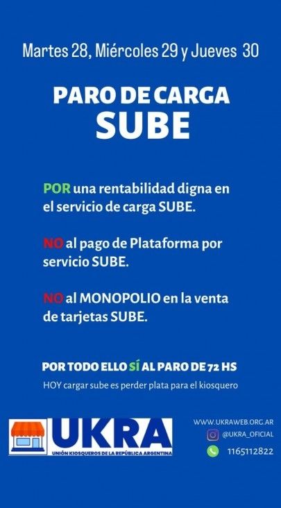 "Para que se termine la especulación con las tarjetas de SUBE, por un valor único en todo el país de las tarjetas, para que las empresas monopólicas no destruyan el sistema. Por esos motivos debido a la falta de respuestas del Estado Nacional vamos al paro con el servicio de carga de Sube martes 28, miércoles 29 y jueves 30 apoyemos a los colegas de todo el país", expresó en su cuenta de Instagram el sindicato el viernes pasado.