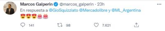 La propia cuenta de Mercado Libre respondió "Quedate con quien te quiera como Galo a Mercado Libre. ¡Nosotros somos sus fans ahora también! Así que, @GioSquizziato, atenta que tenemos una sorpresa para Galo".