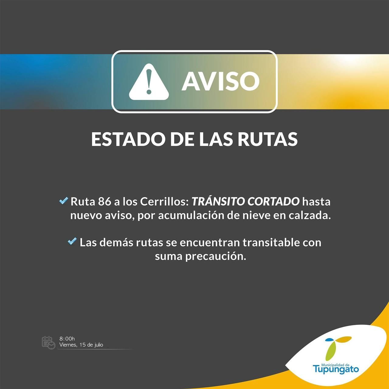 Todos aquellos automóviles particulares que deseen circular por la Ruta Nacional 7 por turismo interno deberán tener en cuenta que la ruta se encuentra transitable hasta la altura de la destilería, en Luján de Cuyo. Por decisión de Vialidad Nacional, se cortó la circulación por dicha ruta, en ambos sentidos (Uspallata-Mendoza), para todo tipo de vehículos, por hielo en la calzada.