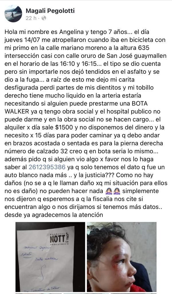 Angelina tiene 7 años y el día jueves fue atropellada por un vehículo que se dio a la fuga cuando circulaba en bicicleta con su primo en San José. El impacto contra el pavimento le provocó múltiples heridas y la pérdida de algunas piezas dentales. Los médicos que la atendieron en el hospital Notti indicaron la utilización de una "bota walker" para su tratamiento, pero el elevado costo de la misma hizo que su mamá viralizara un pedido a través de las redes sociales.