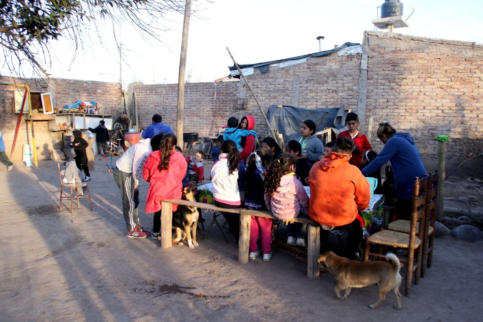 Una mesa con bancos de madera, ubicada en el medio de un patio con piso de tierra, luce un mantel que está listo para recibir a comensales. También hay repisas con juguetes y pelotas o triciclos que hay que esquivar. Esta es la casa de Cecilia Giménez (40), una mendocina que desde hace 10 años tiene un merendero en su hogar.