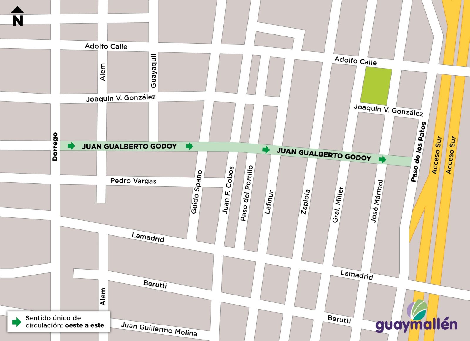 A partir de este jueves 28 de julio, un sector de la calle Juan Gualberto Godoy de Guaymallén tendrá sentido único de circulación, en dirección oeste-este. El cambio se producirá en el tramo comprendido por Dorrego y Paso de los Patos, perteneciente al distrito Dorrego.
