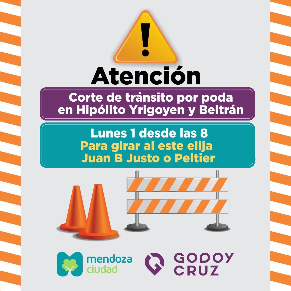 La Ciudad de Mendoza informó que por trabajos de poda, los cuales se realizarán en un operativo conjunto con el municipio de Godoy Cruz, la esquina de las calles Beltrán e Yrigoyen quedará cerrada al tránsito vehicular el lunes 1 de agosto.
