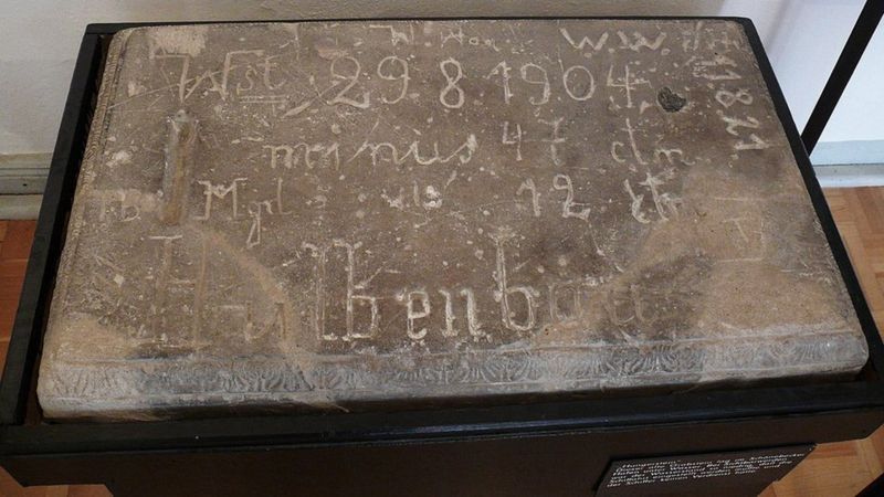 Otra piedra del hambre se exhibe en el Museo de la ciudad de Schönebeck, una antigua lápida que yacía en una dársena del puerto y en la que se tallaron niveles de agua particularmente bajos.