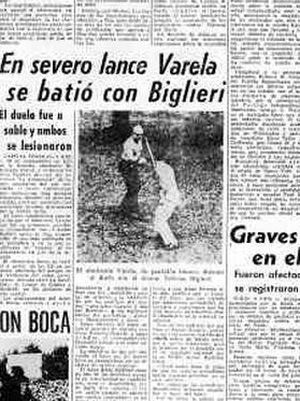 En el primer ataque, Biglieri le cortó parte de la oreja derecha a Varela. En la carga siguiente, lo hirió en el brazo. Varela no se quedó atrás y lastimó a Biglieri en la mano. Con un rápido movimiento Varela le hizo saltar los anteojos a Biglieri y lo lastimó en la nariz: había tirado un hachazo a fondo que por poco no le partió la cabeza al medio como una sandía. (…) En el segundo round, Varela cortó a Biglieri en el pómulo y en el abdomen, pero tampoco la sacó gratis, ya que Biglieri le metió un puntazo en la cadera izquierda. (…). En la tercera vuelta, Biglieri fue a fondo e hirió a Varela en la tetilla izquierda. Estuvo a nada de atravesarle el corazón. El sable cayó de las manos de Varela. Se insultaban y sangraban, pero el duelo no había terminado”.