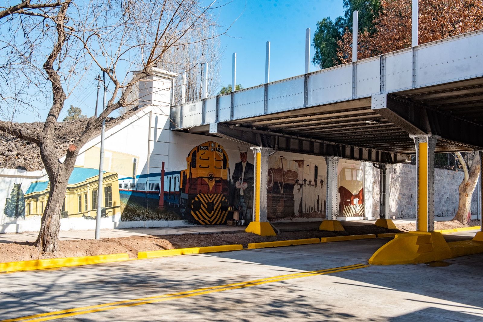 En tanto que las cunetas fueron demolidas y reconstruidas en hormigón (unos 600 m). Además, se concretaron las losas sobre acequias y nichos para forestales. Debajo del puente del metrotranvía, el muralista Leonardo Olivera se encuentra pintando un gran mural (de un total de 4 m), que tiene que ver con el pasado y presente del ferrocarril en nuestra provincia.