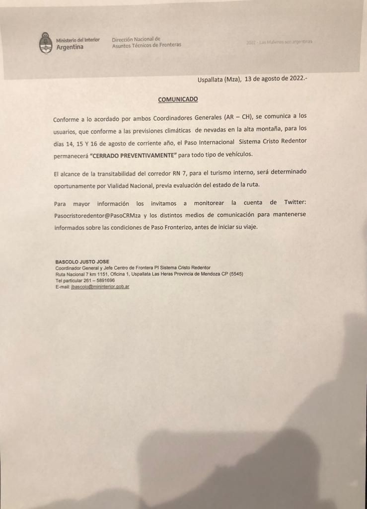 En un comunicado firmado por el Coordinador General del Sistema Integrado Cristo Redentor, Justo José Báscolo, se comunicó a los usuarios que desde este domingo 14 de agosto, al martes 16 del corriente mes se mantendrá cerrado el cruce fronterizo para todo tipo de vehículos.